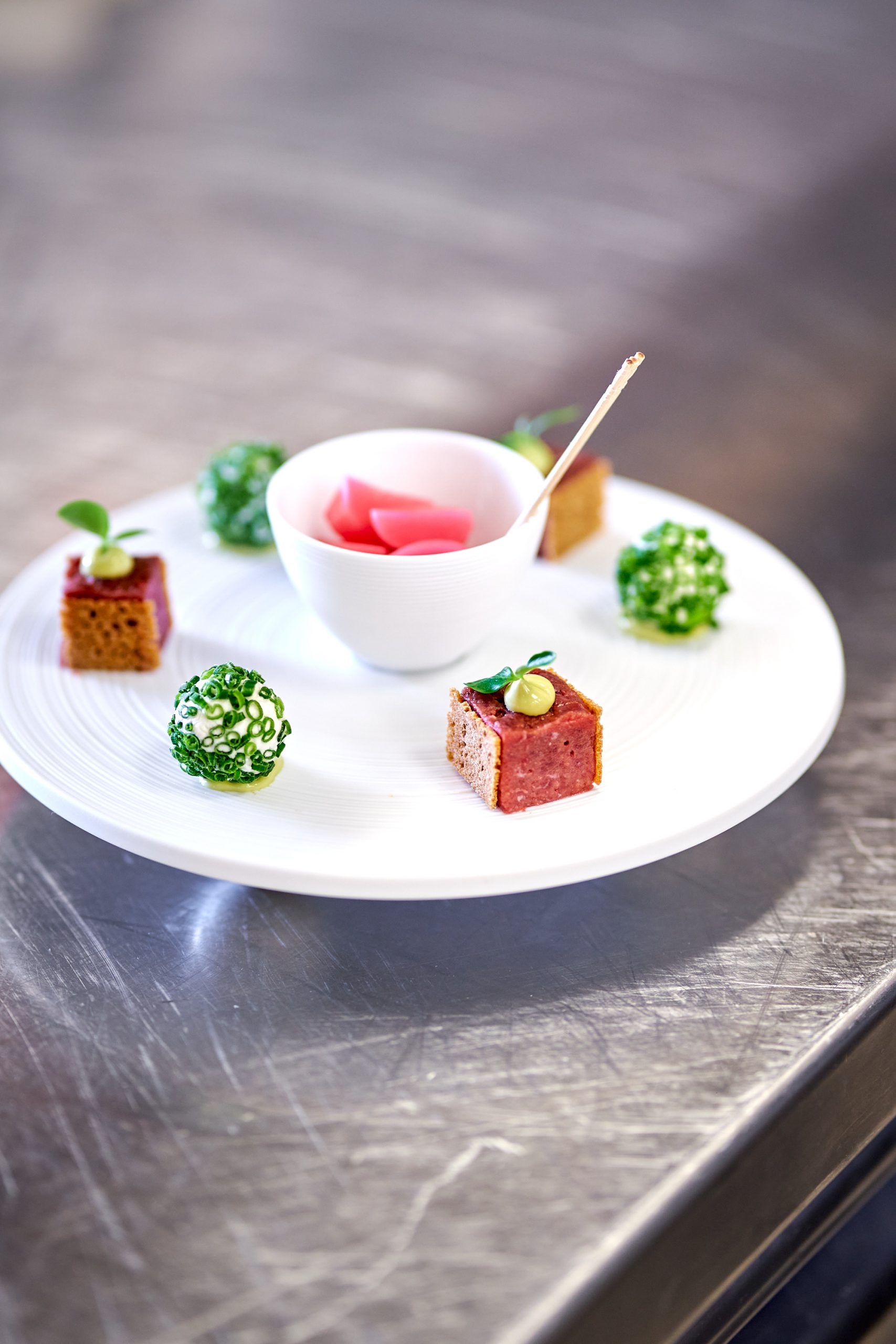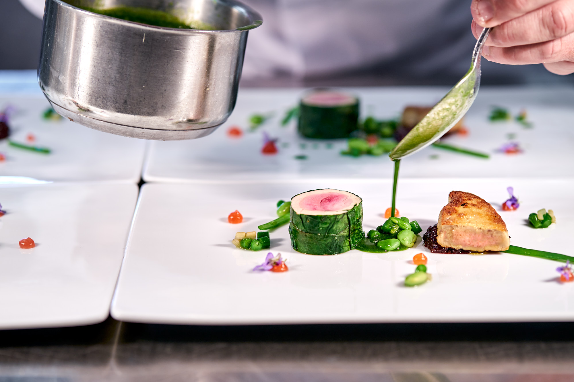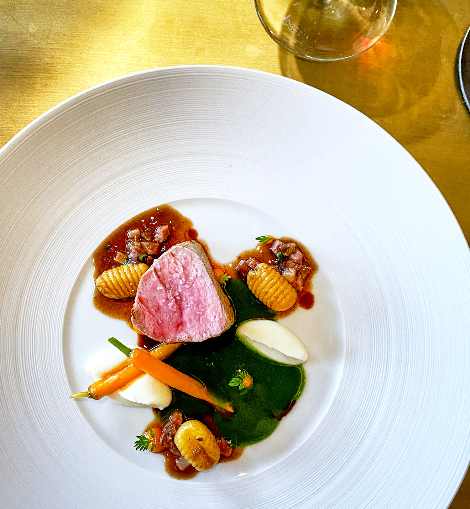 Kalbskopfgnocchi – gebundene Bärlauchbouillion – Selleriemousseline – Feldmöhre