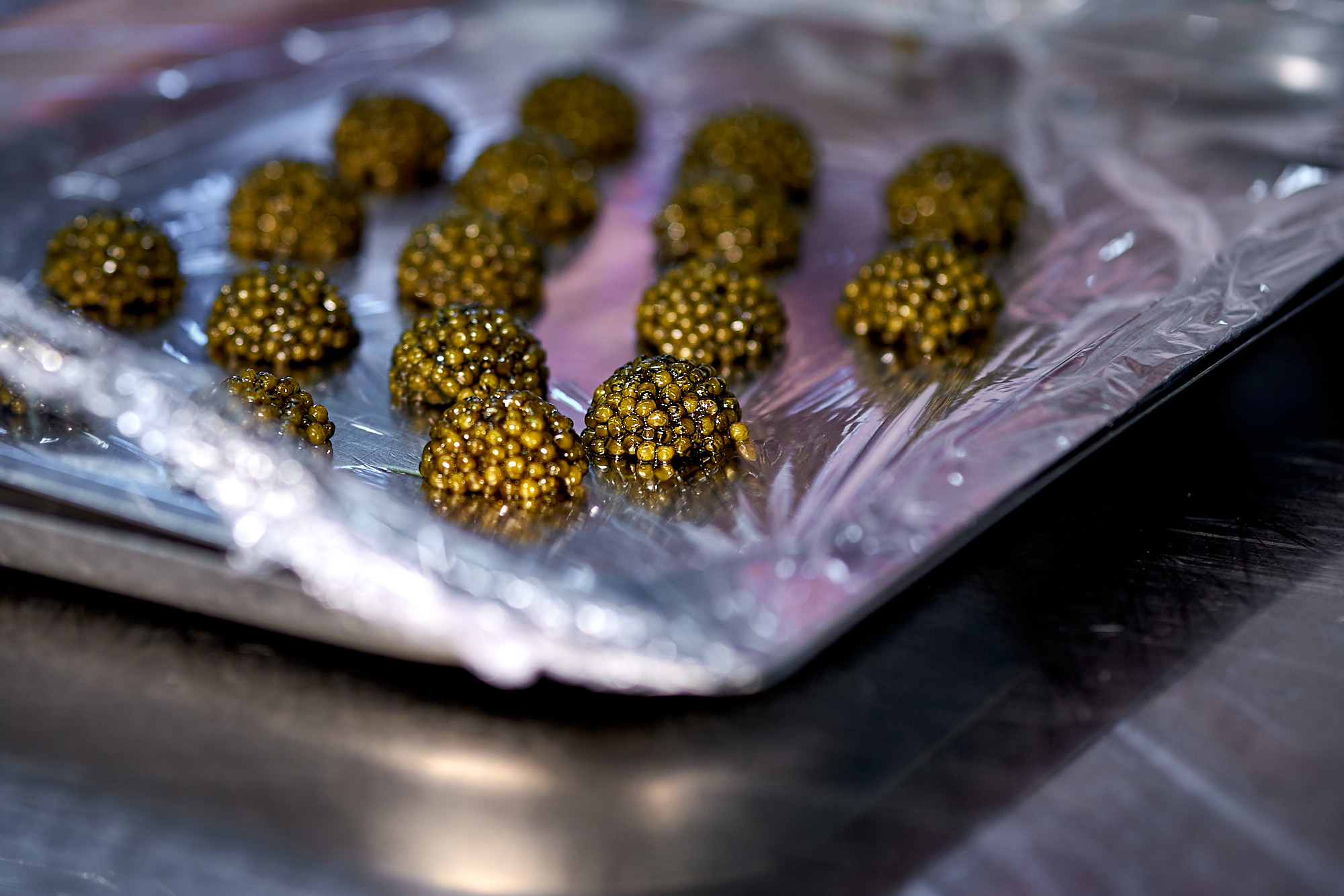 Zirbenessig-Vinaigrette – Perlsago – eigener Rogen – Gurke – Radieserl – Räucherfisch-Espuma