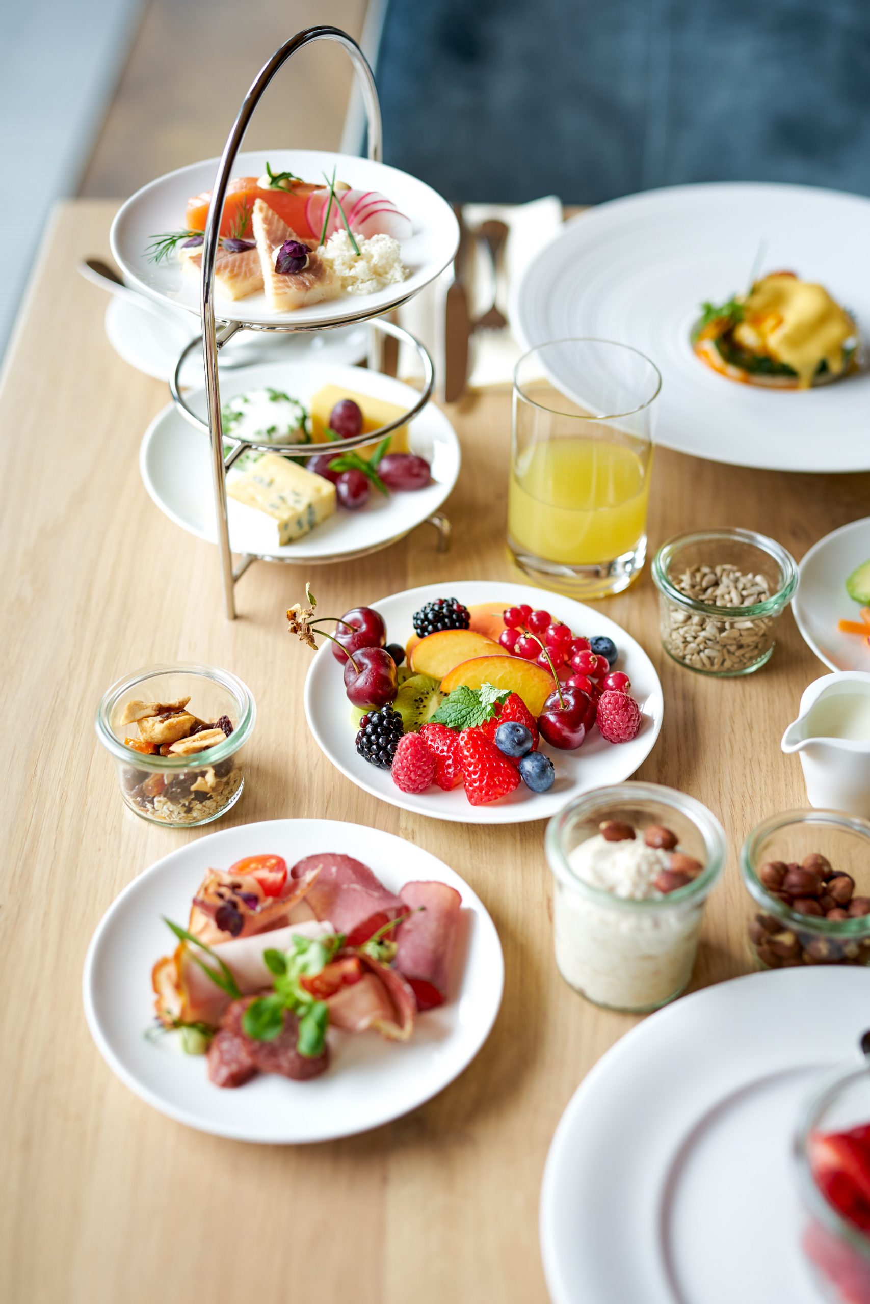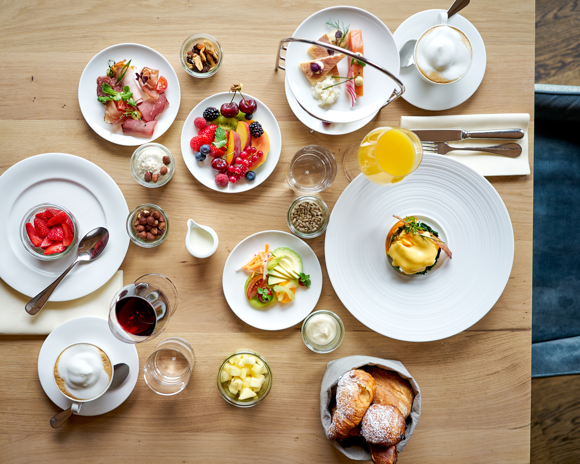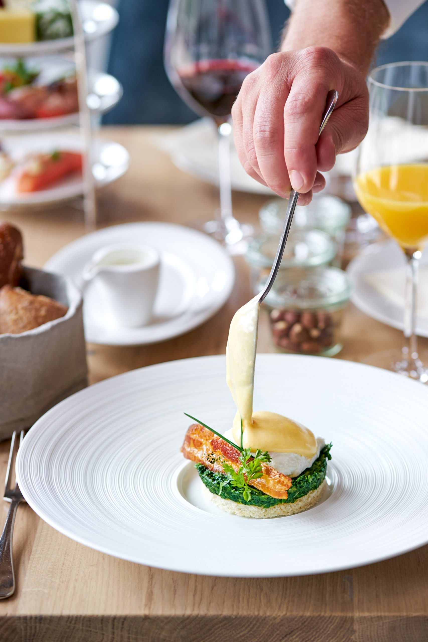 Food-Fotografie im Travel Charme Ifen Hotel Kleinwalsertal: Serviertes Frühstück, Frühstücks-Etageren und Egg Benedict. Alles bei available light (Tageslicht) im Restaurant-Setting. Executive Chef im Hotel: Sascha Kemmerer, Küchenchef zum Shooting: Hans-Joerg Frick.
