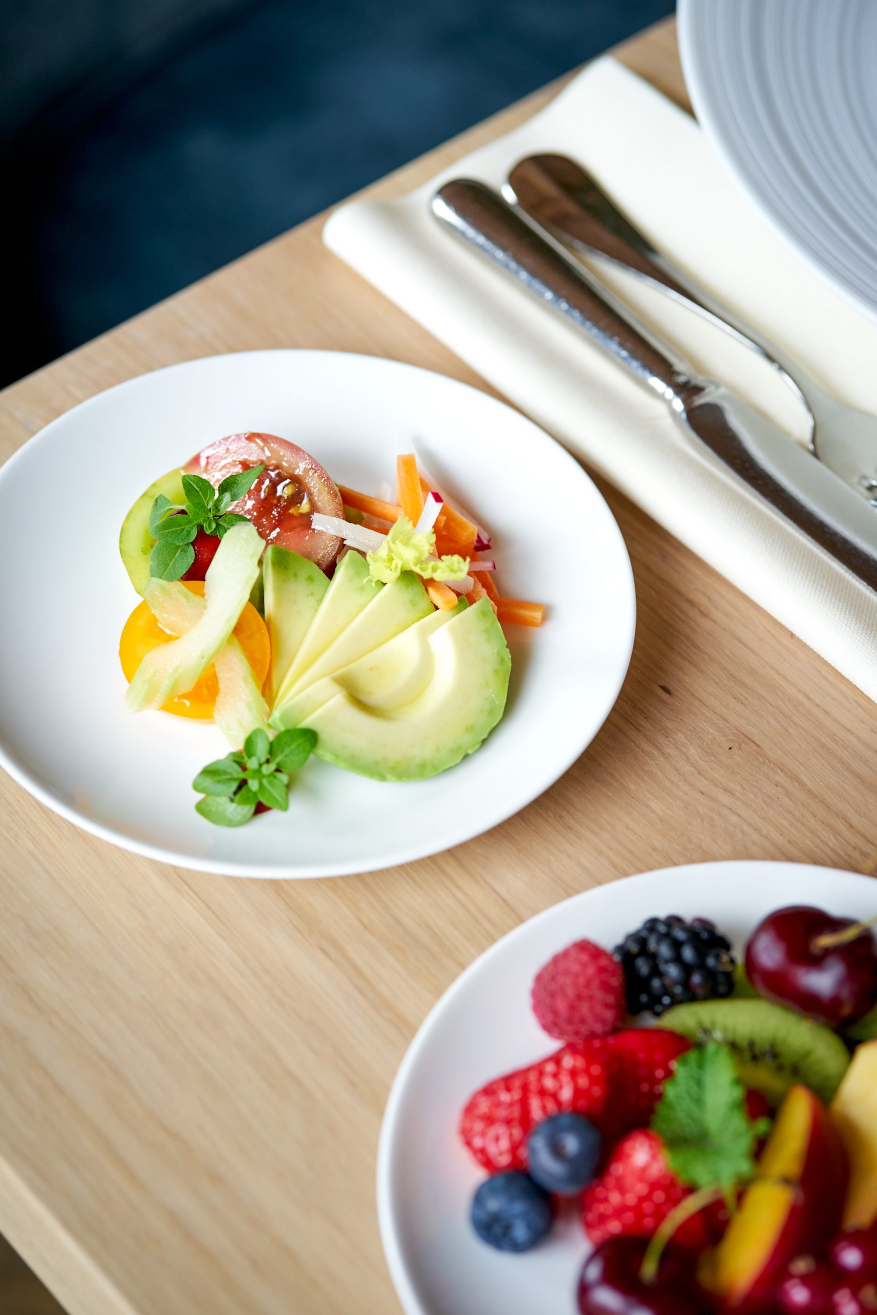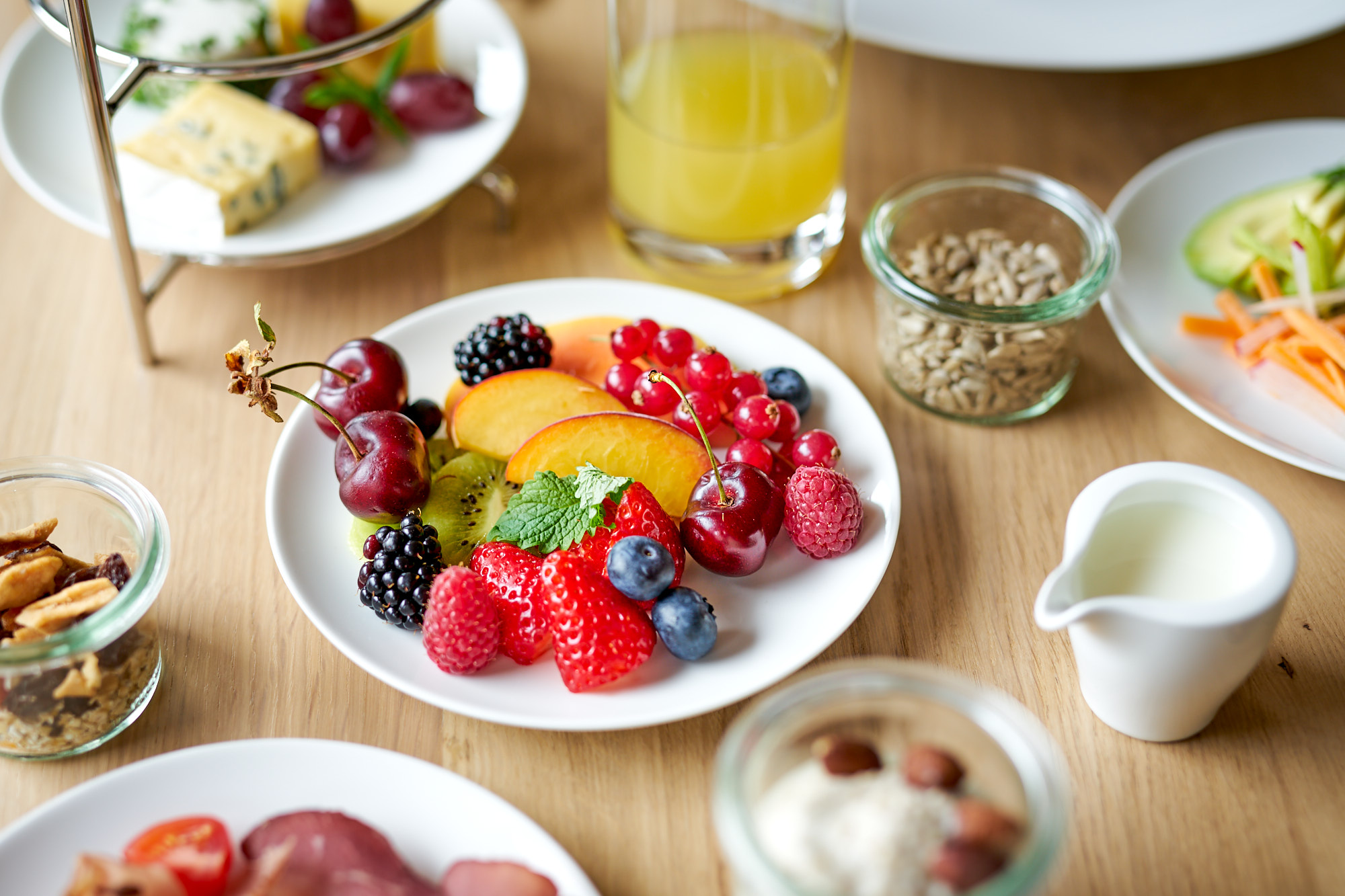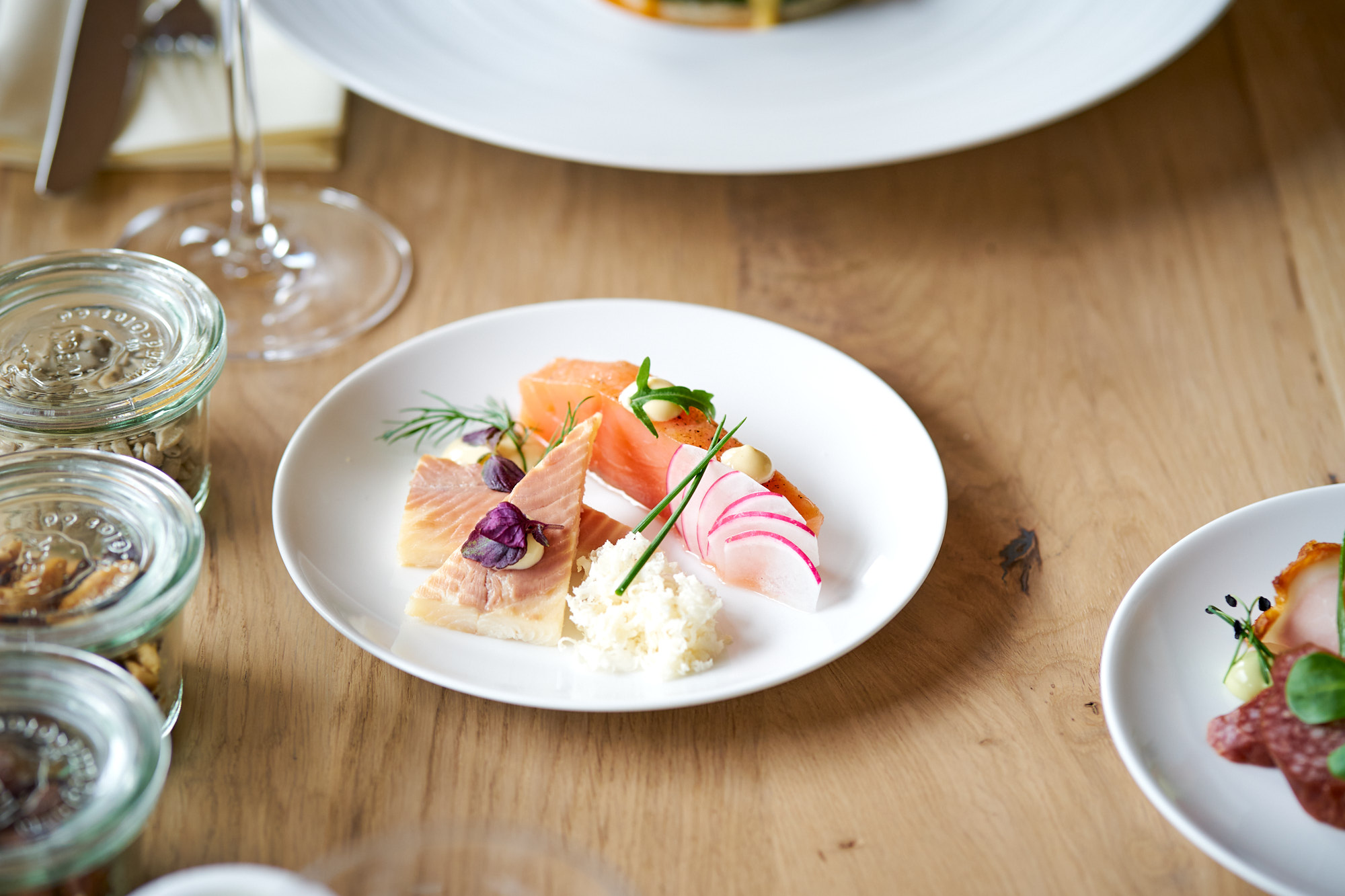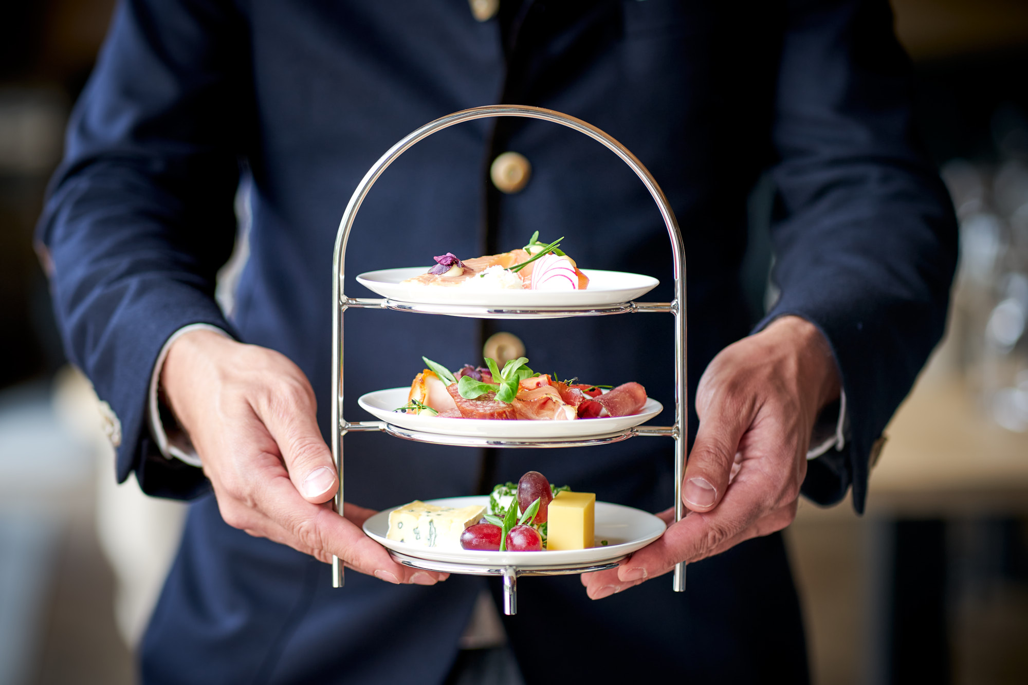 Food-Fotografie im Travel Charme Ifen Hotel Kleinwalsertal: Serviertes Frühstück, Frühstücks-Etageren und Egg Benedict. Alles bei available light (Tageslicht) im Restaurant-Setting. Executive Chef im Hotel: Sascha Kemmerer, Küchenchef zum Shooting: Hans-Joerg Frick.