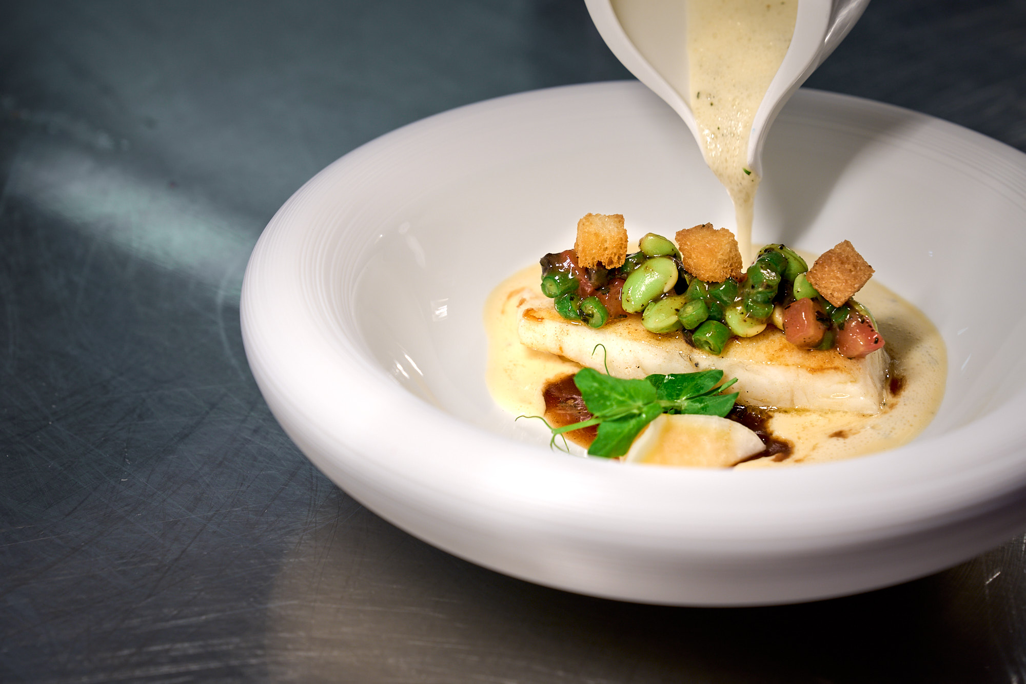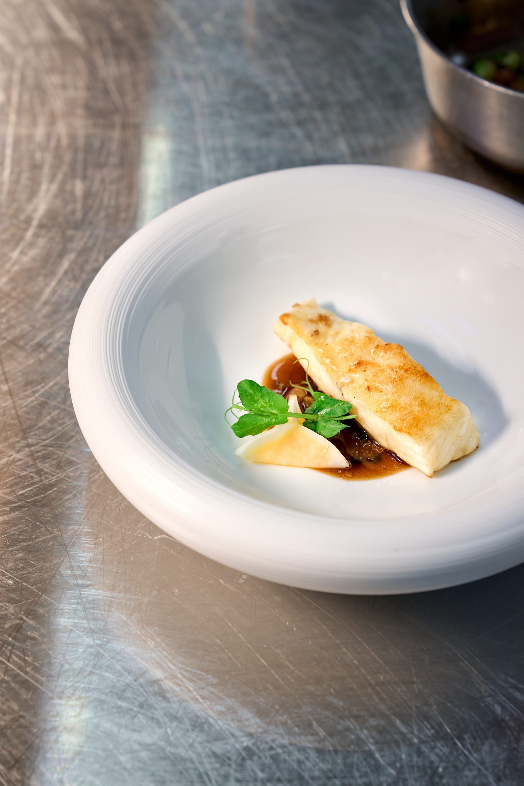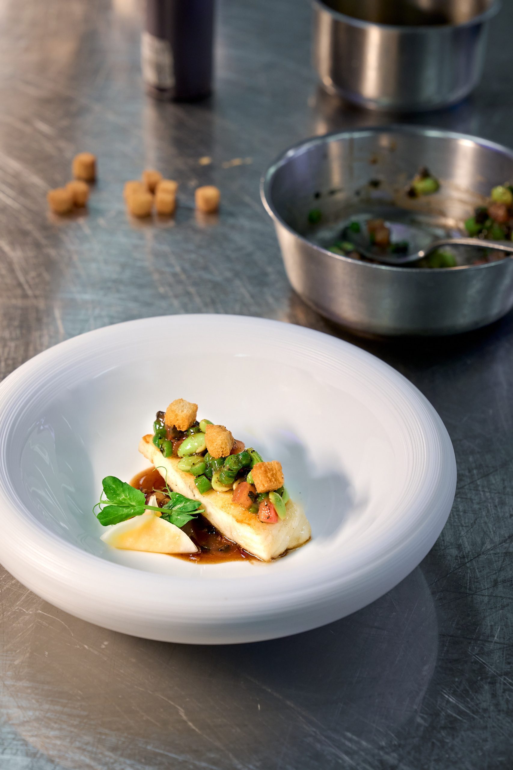 Steinbutt vom Hafenbecken in Concarneau | in Aromabutter gebraten Temperierte Kohlrabitascherl | grüne Bohnenkerne Jus von Kalbskopf & Périgordtrüffel | Sarriette-Nage