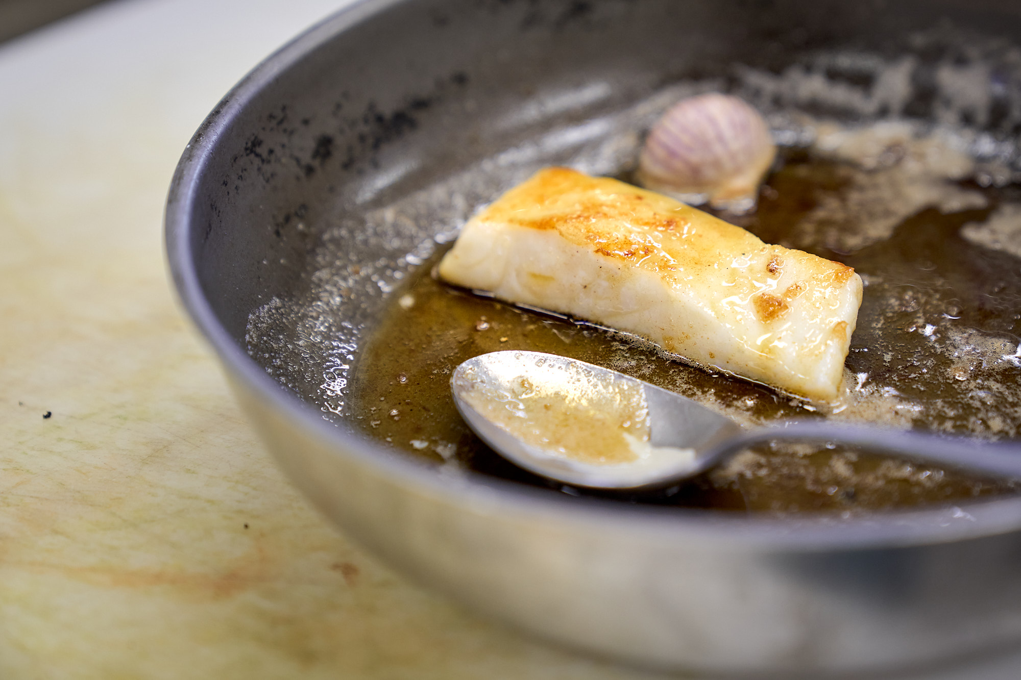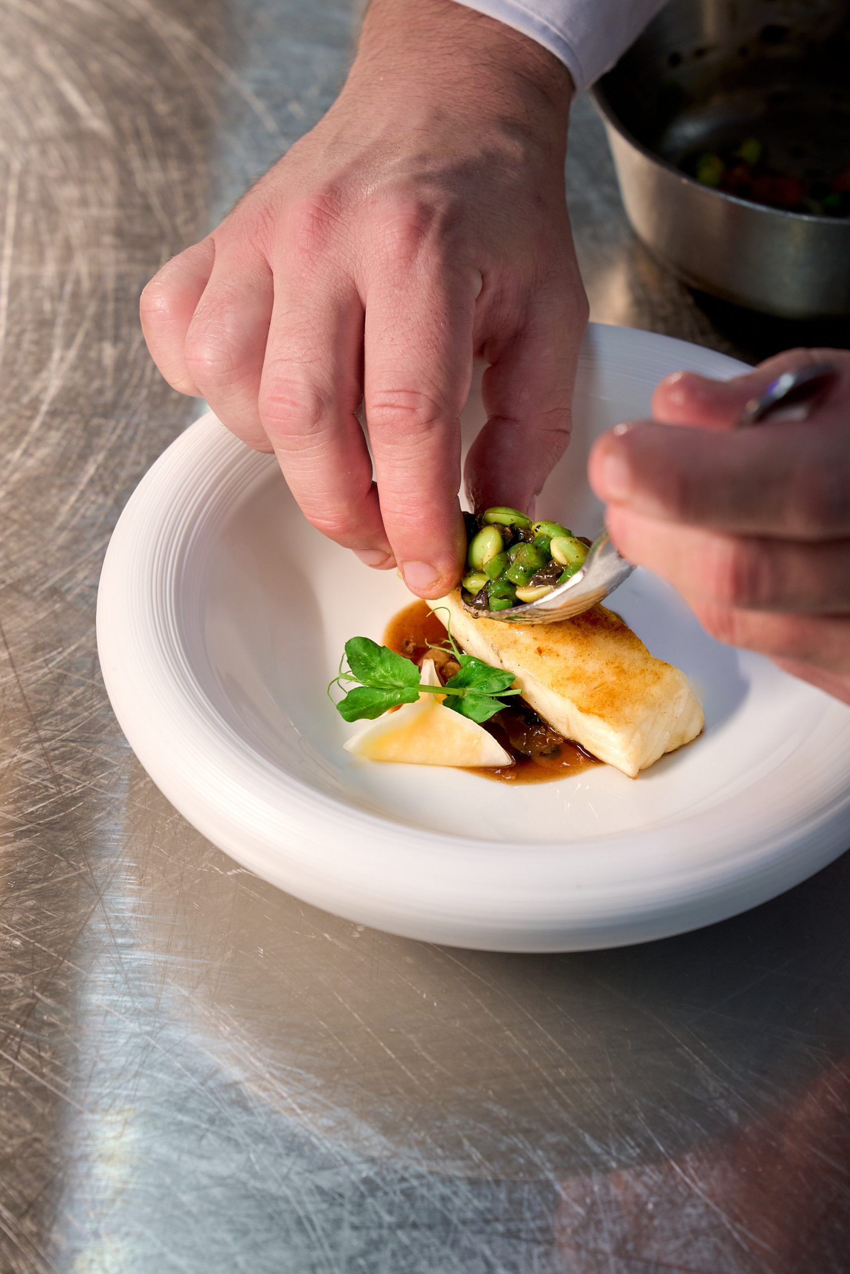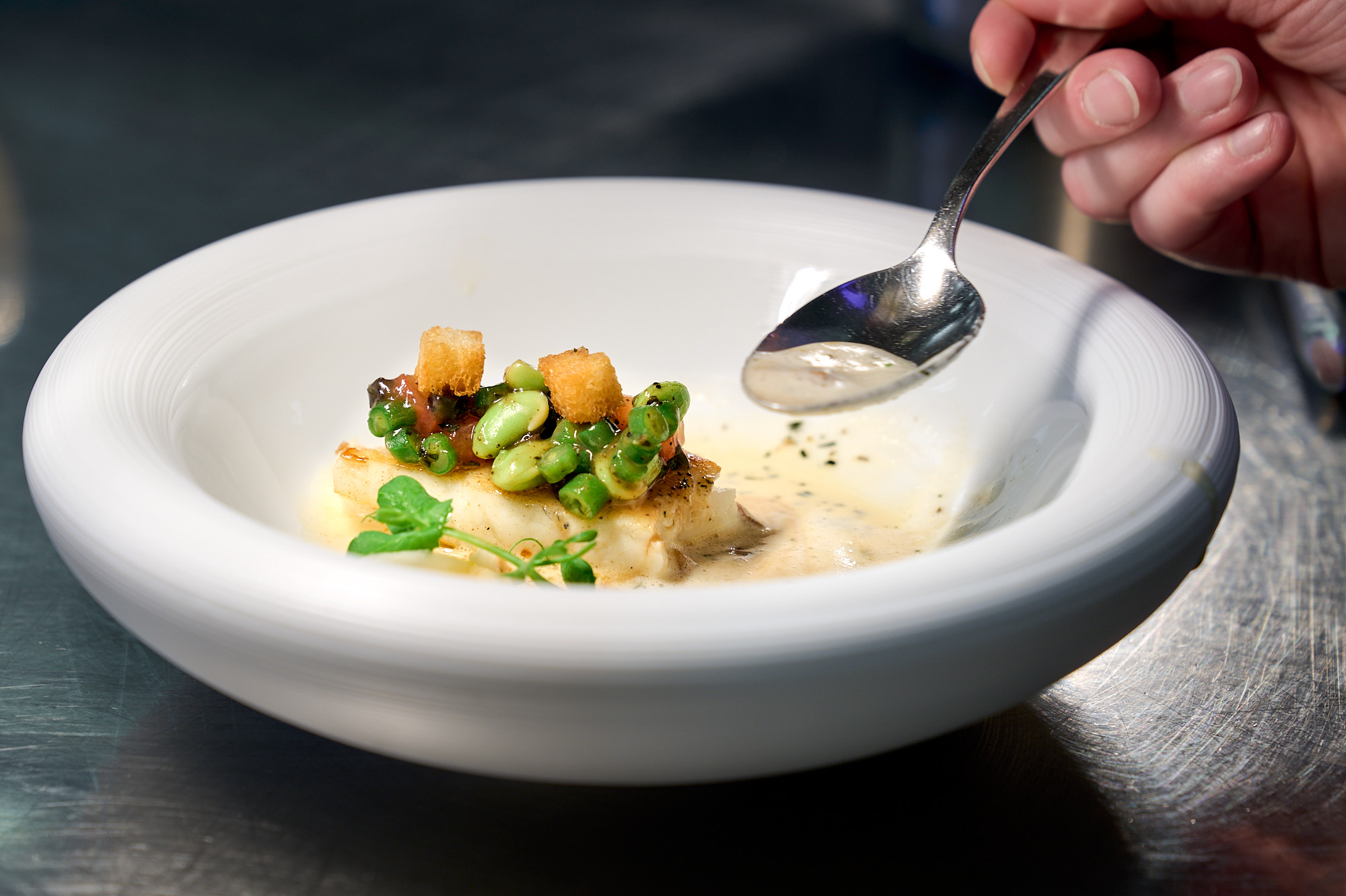 Steinbutt vom Hafenbecken in Concarneau | in Aromabutter gebraten Temperierte Kohlrabitascherl | grüne Bohnenkerne Jus von Kalbskopf & Périgordtrüffel | Sarriette-Nage