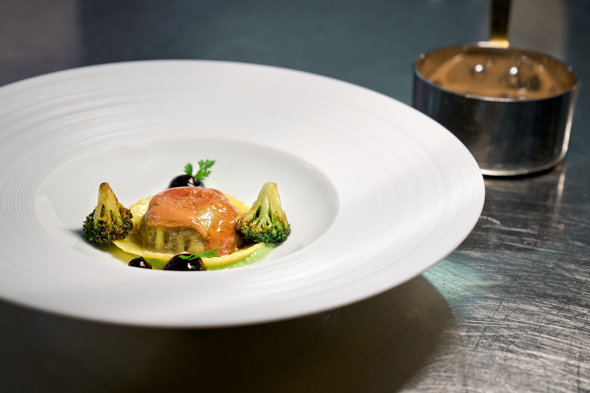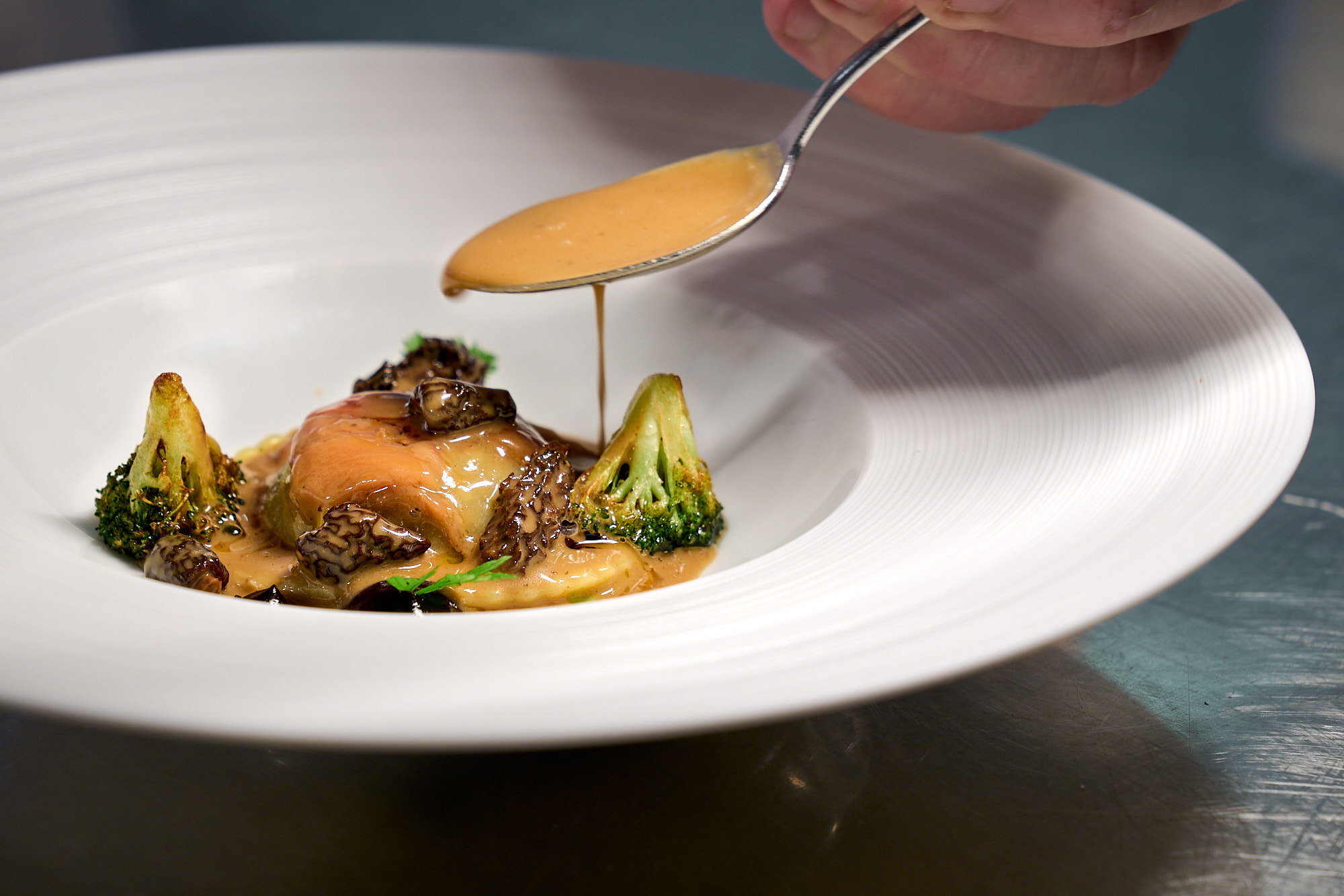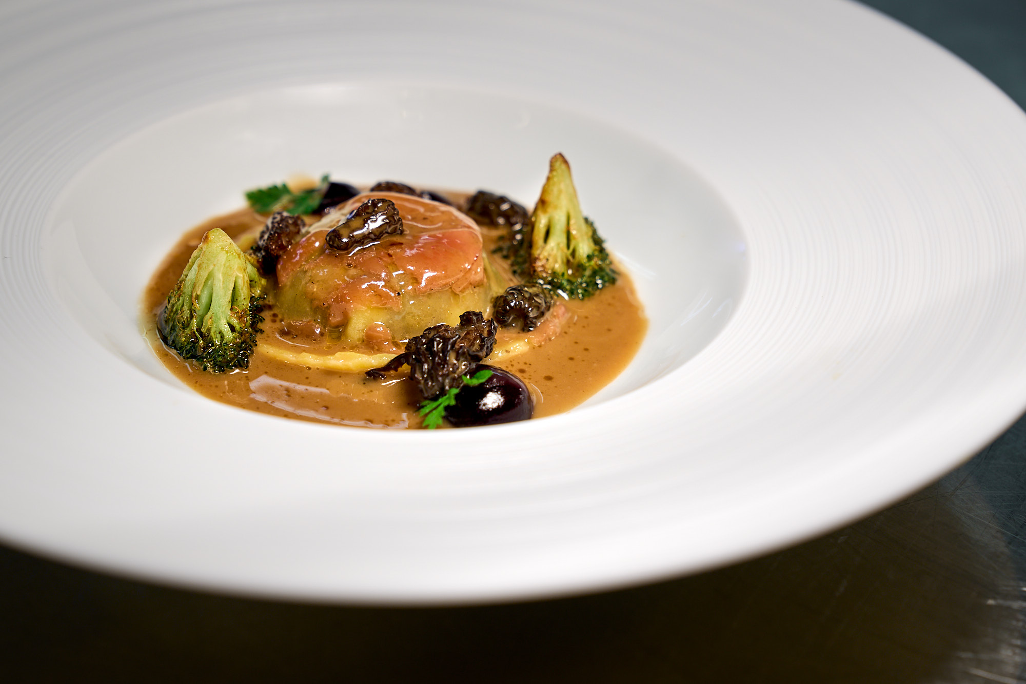 Geschmorter Maibock im Ravioli | geschmolzene Entenleber Morchelnage | Brokkoli als Creme & geröstet | Weichsel-Pfeffergel