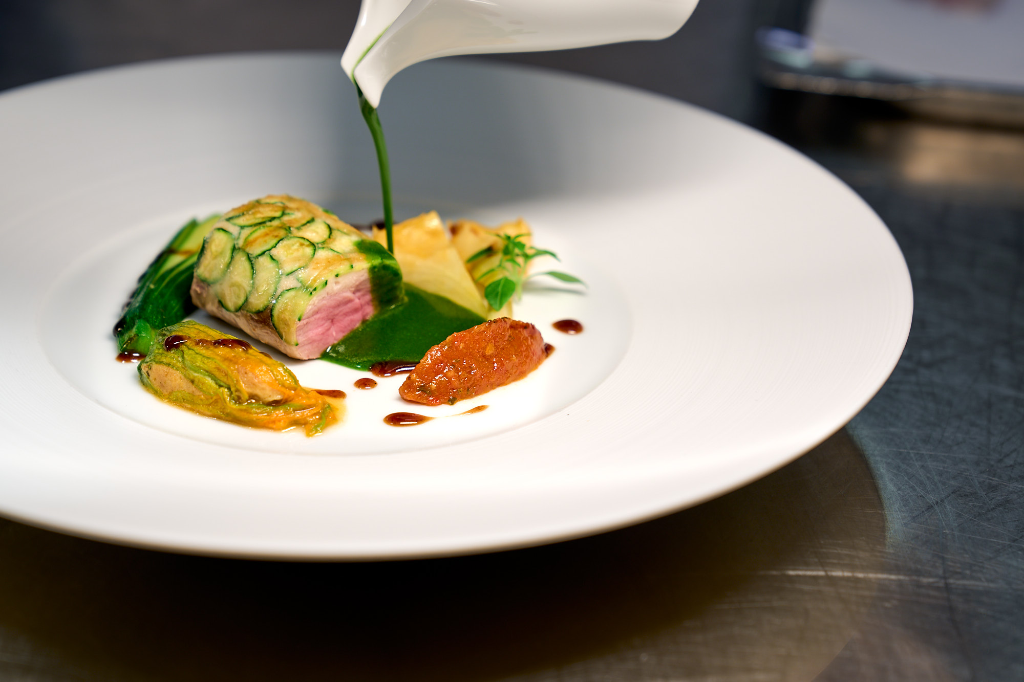 Österreichisches Bauernlamm | im Schweinenetz gegart Poweraden | Paradeiser-Chutney | gebundene Bouillon vom Bärlauch | Zucchiniblüte