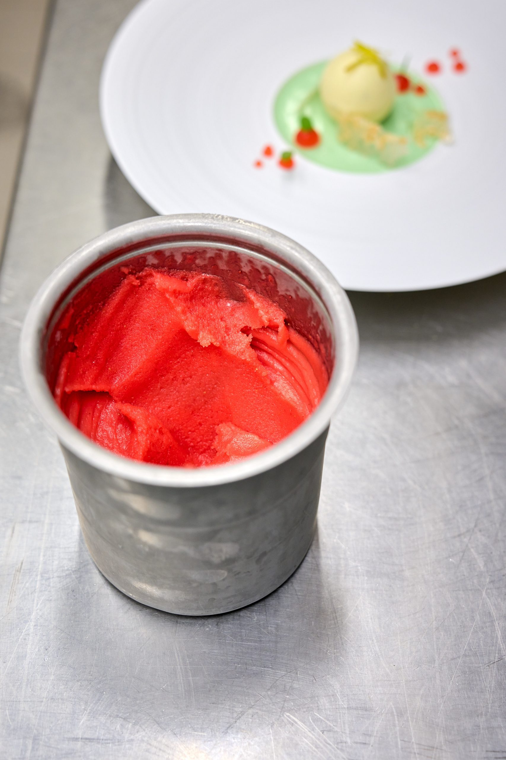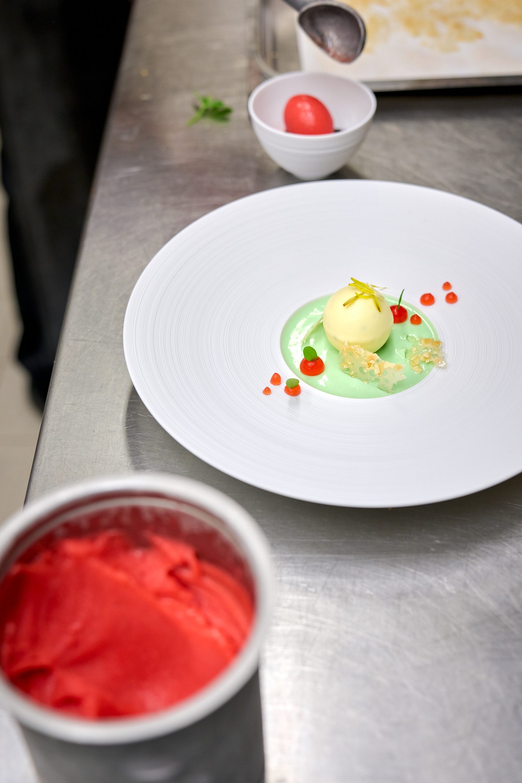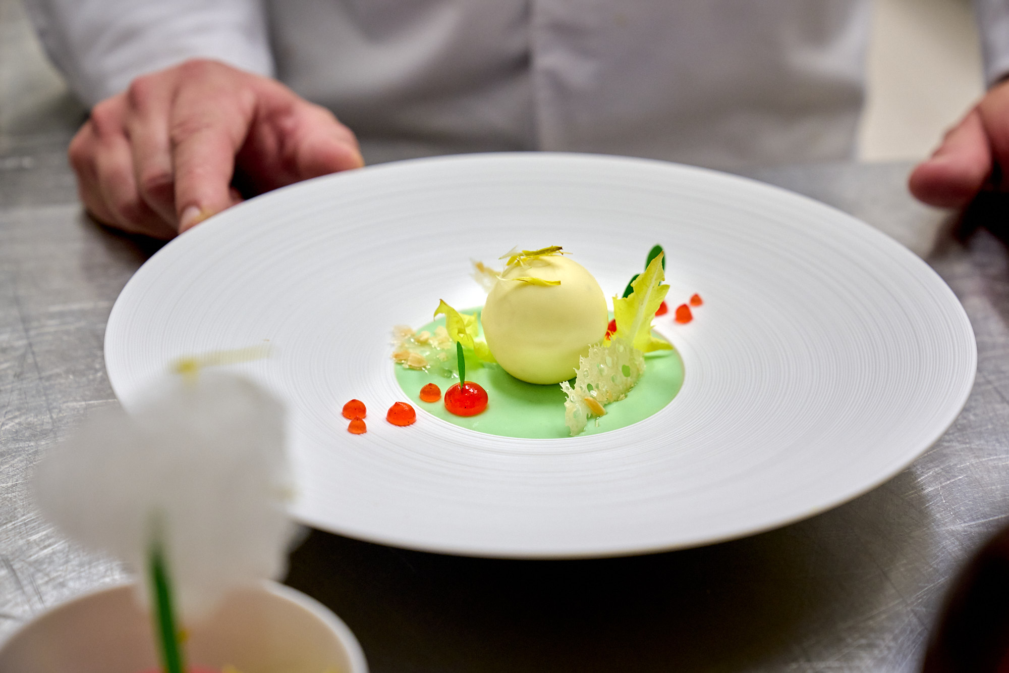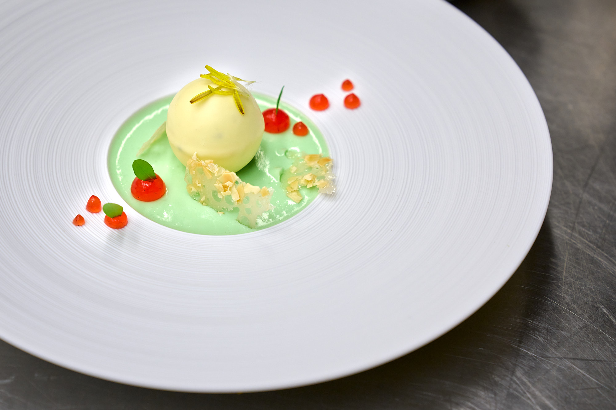 Valrhona Opalys | Löwenzahn-Honigmousse | Creme von Waldmeister und Ländle Joghurt