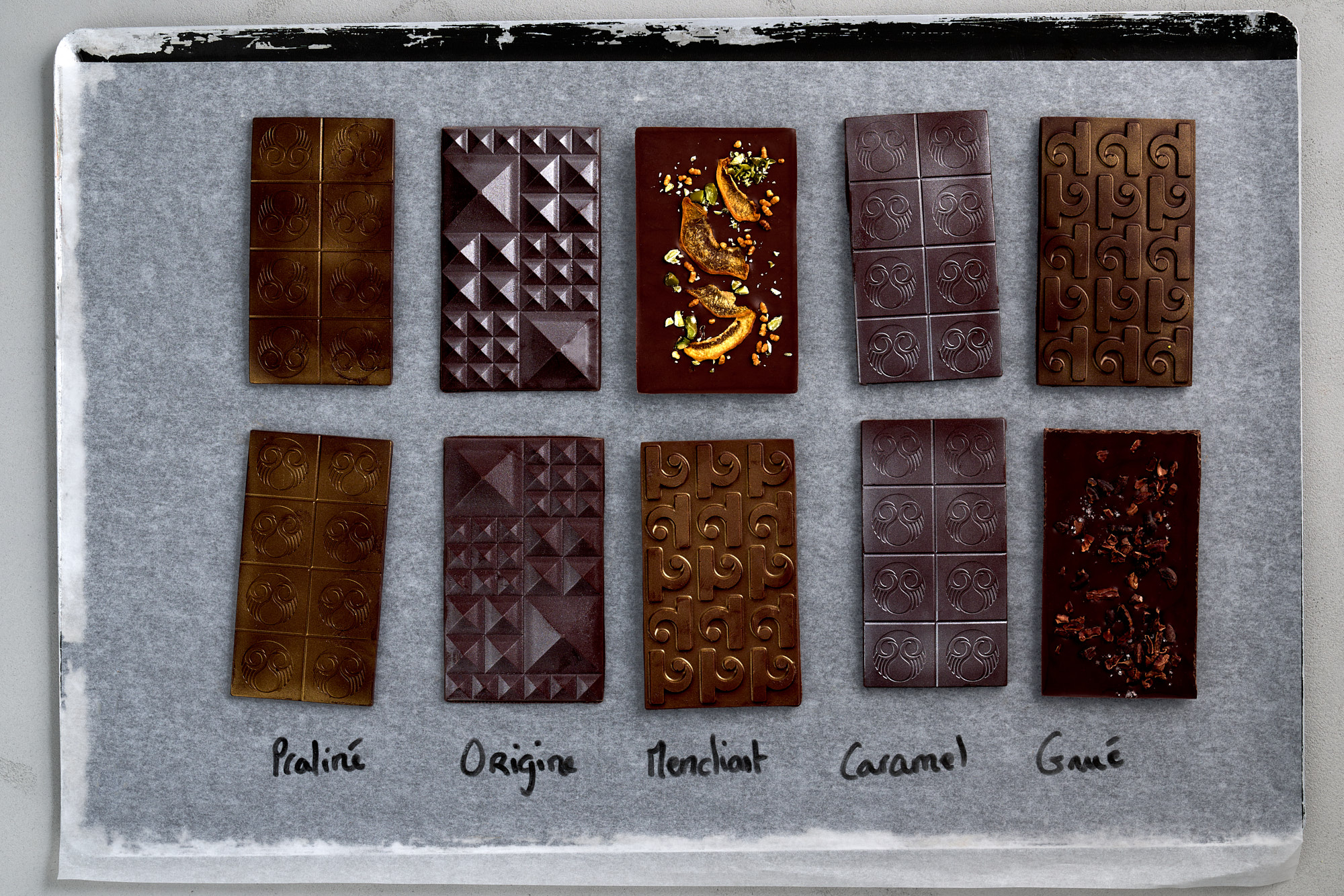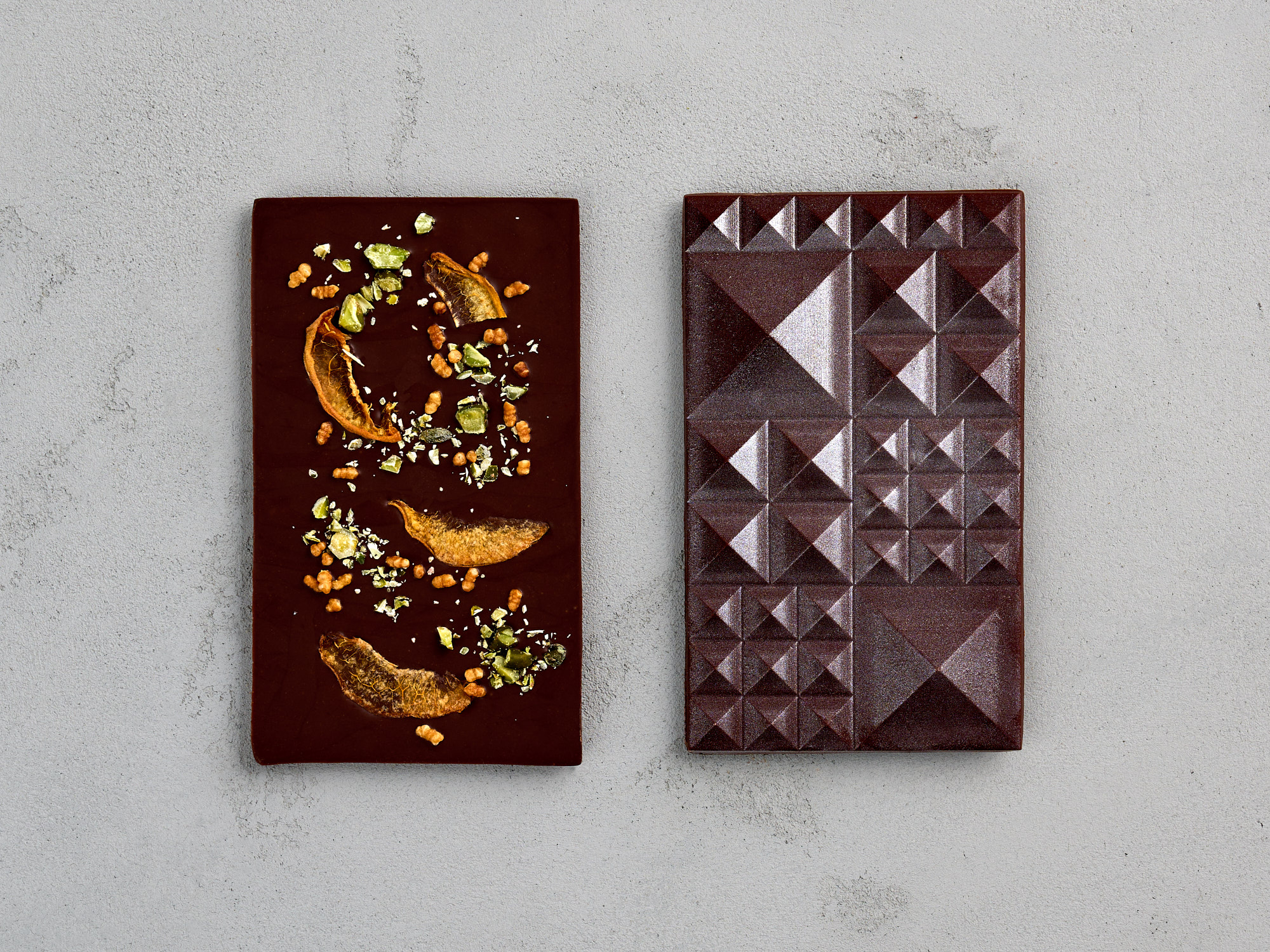 Die Fotografien zeigen die Schokoladen in makellosem Detail. Die Oberfläche der Schokolade ist präzise abgelichtet, sodass man die Feinheiten der Textur nahezu nachvollziehen kann. Andere Aufnahmen präsentieren die Tafeln in ihrer geometrischen Präzision und mit dezenten Verzierungen, die sowohl das handwerkliche Können als auch die kreative Signatur widerspiegeln. Dennoch war die Prämisse bei der Retusche, der Schokolade so viel Natürlichkeit wie möglich zu belassen, und sie nicht zu einem artifiziellen Produkt zu verkünsteln – und sie dennoch perfekt aussehen zu lassen.